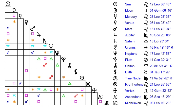 | Neptune | 17 Leo 42 | 1 Aries 53 | 20 Leo 22 |