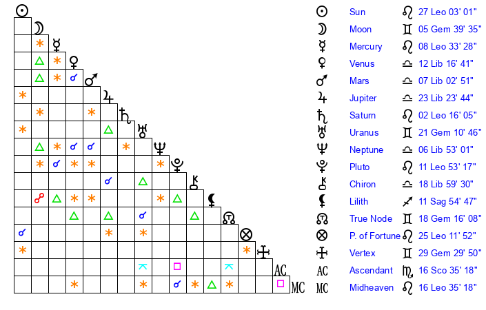 | Pluto | 11 Leo 53 | 1 Aquarius 58 | 13 Leo 21 |