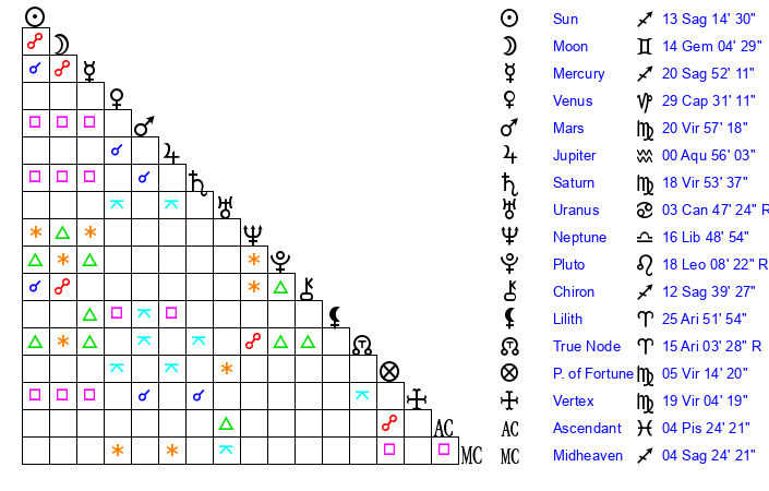 | Sun | 13 Sagittarius 15 | 13 Sagittarius 49 | 0 Pisces 29 |