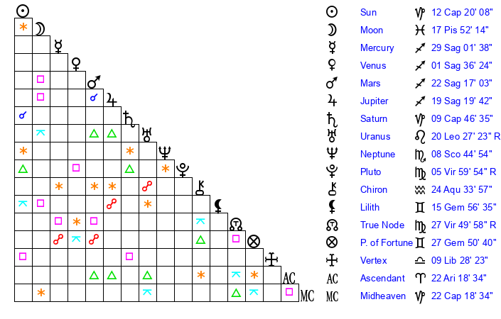 | Sun | 12 Capricorn 20 | 13 Capricorn 34 | 18 Pisces 8 |