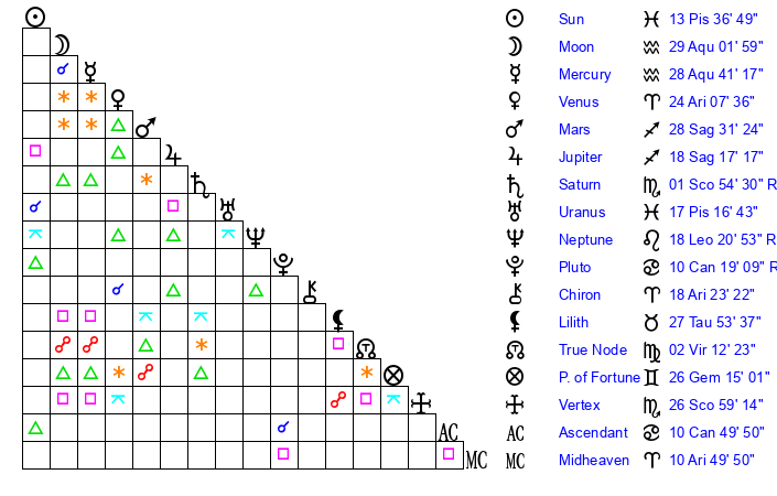| Pluto | 10 Cancer 19 | 2 Aquarius 58 | 11 Cancer 22 |