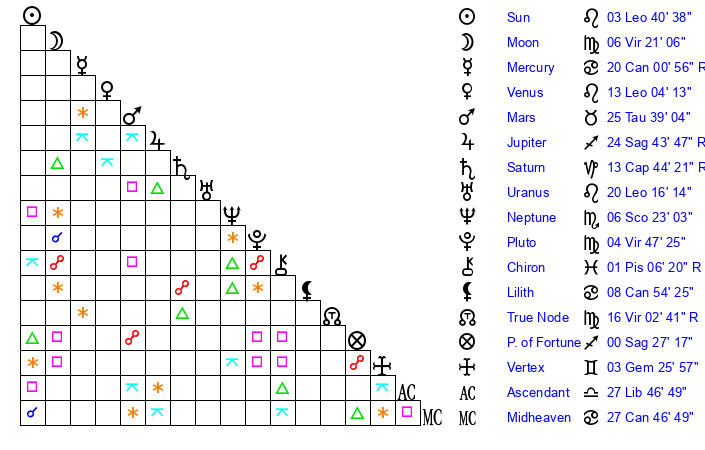 | Moon | 6 Virgo 28 | 27 Leo 48 | 28 Capricorn 27 |