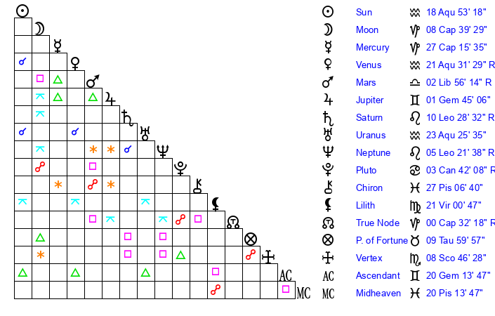 | Sun | 18 Aquarius 53 | 19 Aquarius 56 | 4 Gemini 22 |