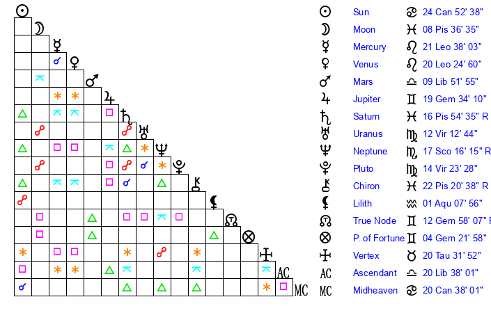 | Venus | 20 Leo 26 | 14 Gemini 36 | 2 Scorpio 13 |