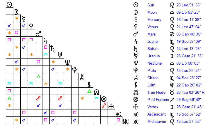 | Moon | 9 Libra 57 | 12 Cancer 33 | 12 Leo 15 |