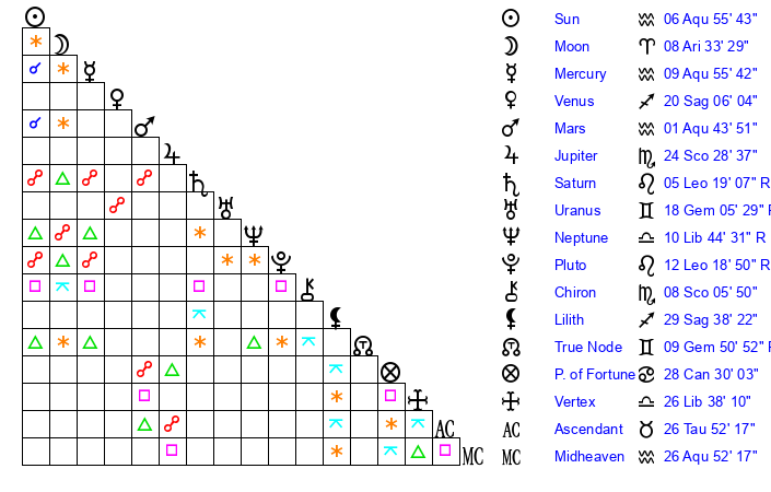 | Sun | 6 Aquarius 56 | 8 Aquarius 1 | 24 Aries 53 |
