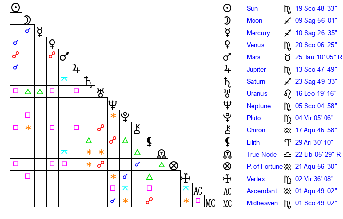 | Sun | 19 Scorpio 48 | 20 Scorpio 34 | 27 Capricorn 52 |