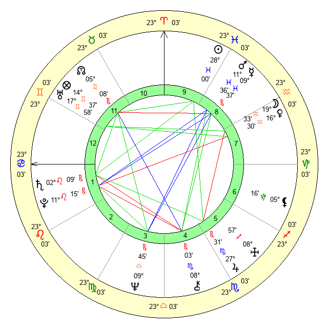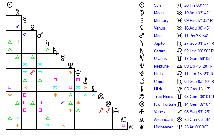 | Pluto | 11 Leo 14 | 3 Aquarius 19 | 11 Leo 22 |