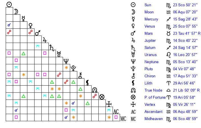 | Sun | 23 Scorpio 50 | 24 Scorpio 35 | 1 Aquarius 56 |