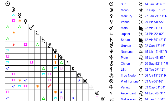 | Moon | 2 Capricorn 56 | 28 Leo 11 | 20 Virgo 40 |