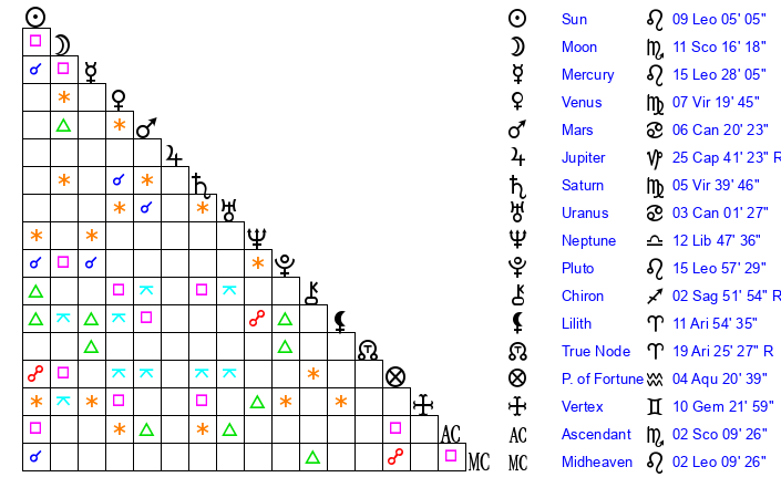 | Pluto | 15 Leo 57 | 2 Aquarius 24 | 17 Leo 55 |