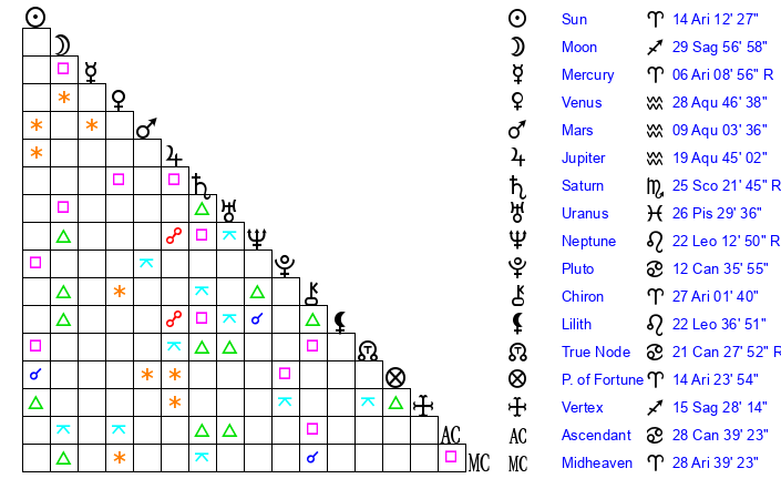 Jupiter | 19 Aquarius 40 | 16 Gemini 34 | 25 Aquarius 58 |