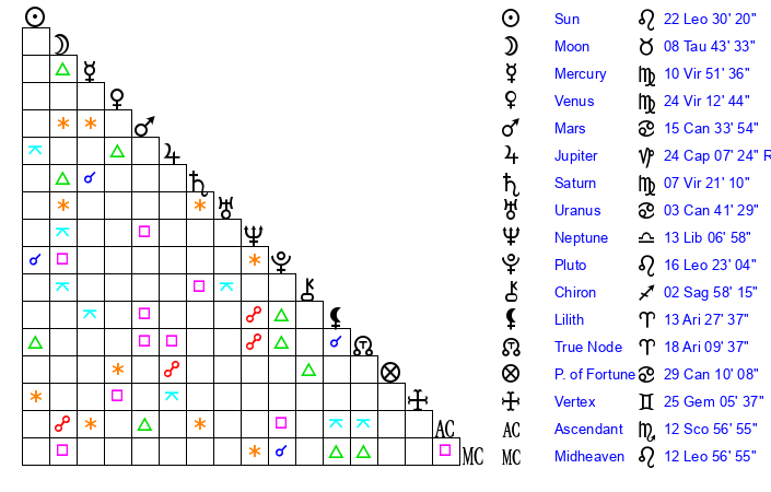 | Pluto | 16 Leo 23 | 2 Aquarius 5 | 18 Leo 6 |