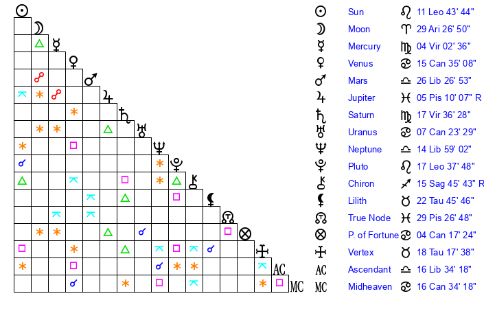 | Sun | 11 Leo 44 | 12 Leo 34 | 24 Libra 45 |