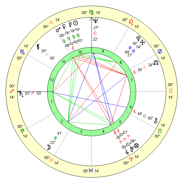| Venus | 18 Virgo 51 | 15 Leo 38 | 6 Scorpio 31 |