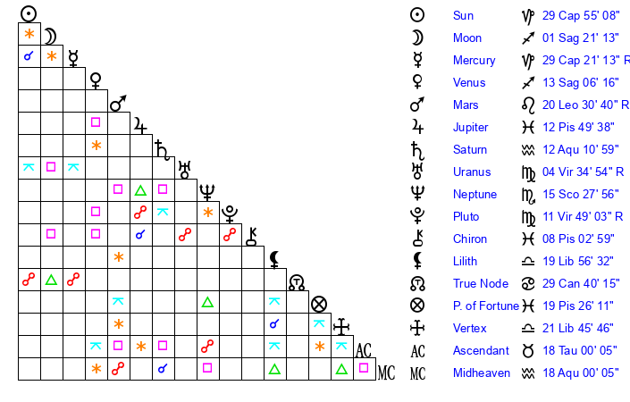 | Mercury | 29 Capricorn 21 | 18 Capricorn 16 | 25 Pisces 18 |