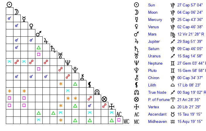 | Mercury | 25 Capricorn 43 | 15 Capricorn 11 | 10 Gemini 27 |