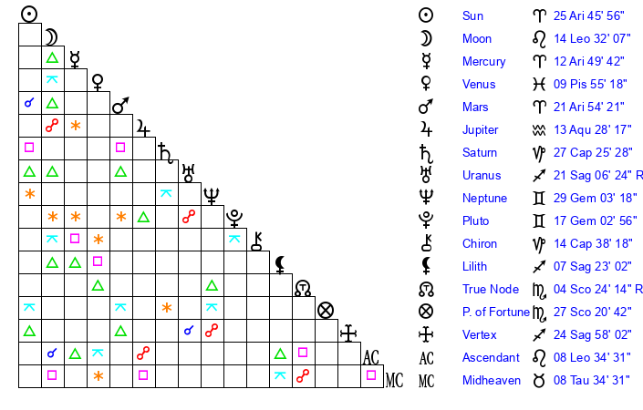 | Sun | 25 Aries 45 | 26 Aries 57 | 23 Leo 49 |