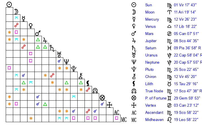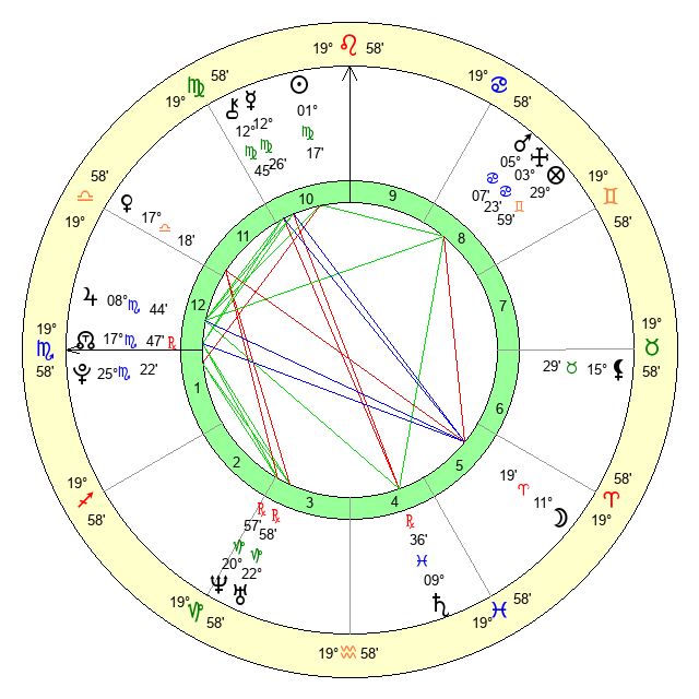 | Sun | 1 Virgo 17 | 1 Virgo 47 | 1 Libra 25 |
