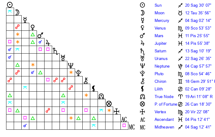 | Sun | 20 Sagittarius 30 | 21 Sagittarius 18 | 29 Capricorn 13 |