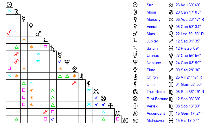 | Sun | 23 Aquarius 30 | 24 Aquarius 14 | 23 Pisces 38 |