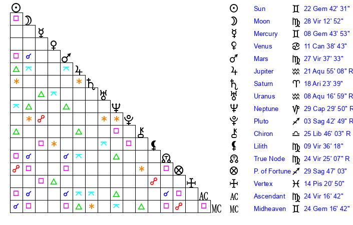 | Sun | 22 Gemini 42 | 22 Gemini 56 | 19 Cancer 25 |