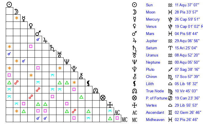 | Sun | 11 Aquarius 37 | 12 Aquarius 4 | 8 Pisces 54 |