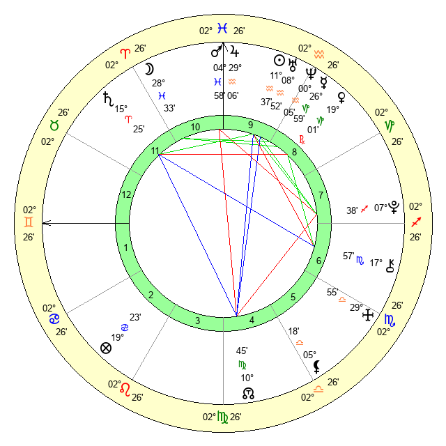| Mars | 4 Pisces 59 | 20 Cancer 33 | 26 Pisces 8 |