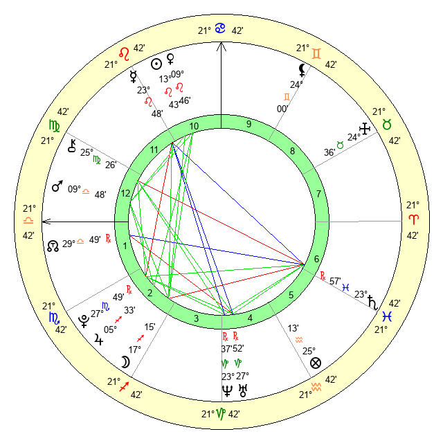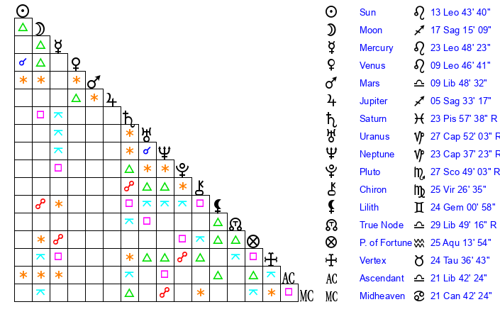 Venus | 9 Leo 47 | 7 Cancer 33 | 16 Virgo 55 |