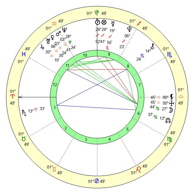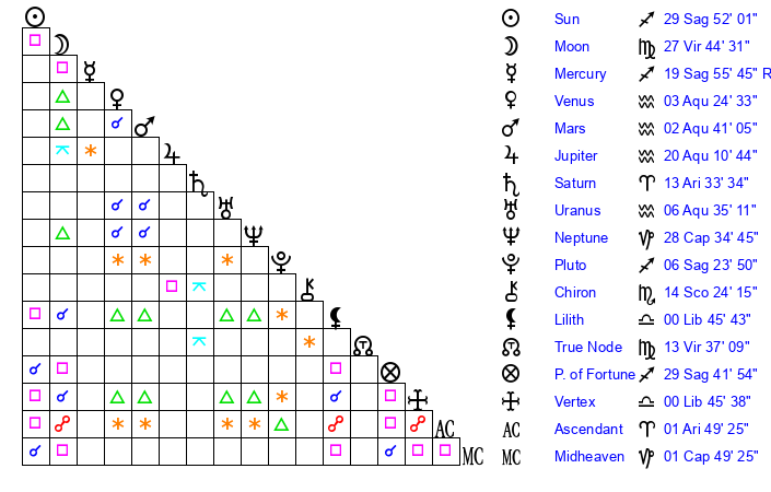 | Moon | 27 Virgo 42 | 17 Virgo 1 | 23 Virgo 38 |