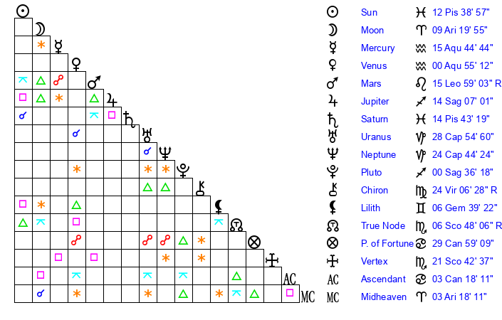 | Sun | 12 Pisces 38 | 13 Pisces 22 | 12 Aries 29 |