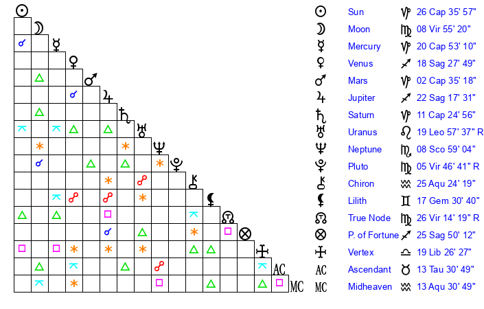 | Moon | 8 Virgo 57 | 12 Virgo 30 | 4 Aquarius 2 |