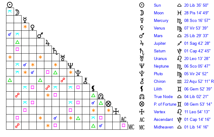 | Venus | 7 Virgo 53 | 1 Libra 1 | 13 Scorpio 51 |