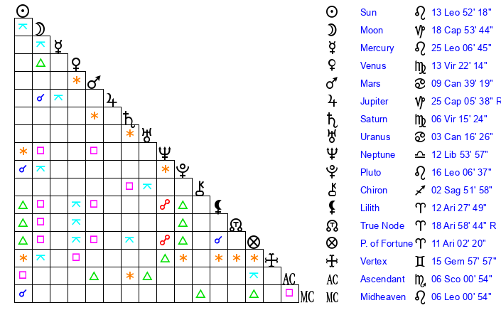 | Pluto | 16 Leo 6 | 2 Aquarius 17 | 18 Leo 0 |