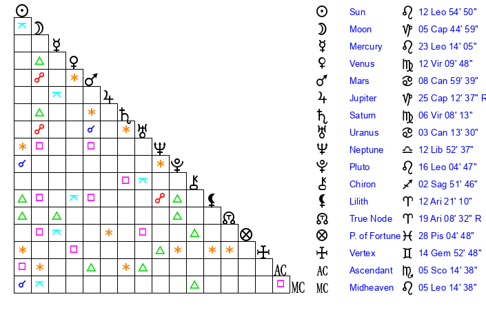 | Moon | 5 Capricorn 40 | 29 Sagittarius 56 | 10 Libra 10 |