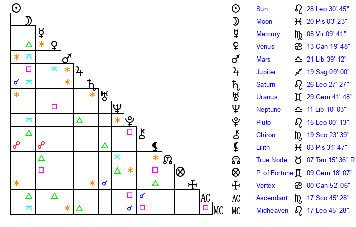 | Moon | 20 Pisces 7 | 9 Leo 47 | 22 Capricorn 4 |