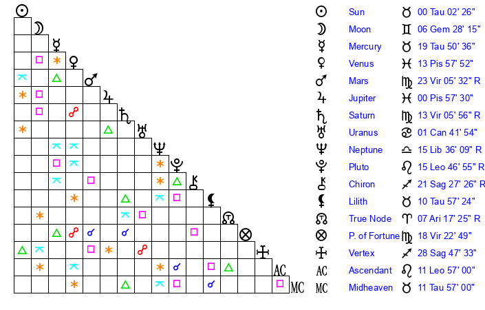 | Venus | 13 Pisces 58 | 25 Pisces 45 | 8 Gemini 33 |