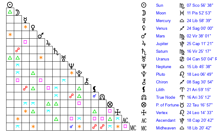 | Sun | 7 Scorpio 57 | 8 Scorpio 31 | 25 Capricorn 0 |