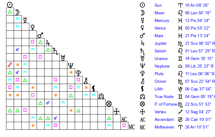 | Venus | 0 Pisces 56 | 27 Pisces 41 | 4 Gemini 37 |