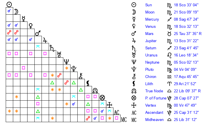 | Sun | 18 Scorpio 33 | 19 Scorpio 18 | 26 Capricorn 35 |