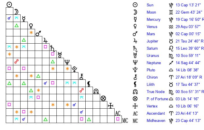 | Mercury | 19 Capricorn 16 | 2 Capricorn 48 | 15 Aquarius 51 |