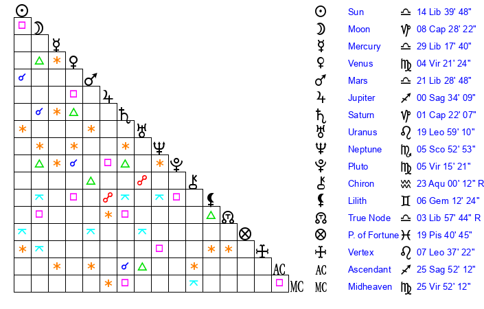 | Sun | 14 Libra 40 | 15 Libra 40 | 20 Sagittarius 56 |