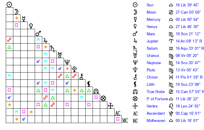 | Venus | 27 Libra 47 | 26 Virgo 3 | 15 Capricorn 1 |