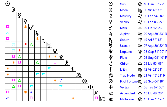 | Moon | 0 Virgo 48 | 21 Sagittarius 46 | 9 Virgo 14 |