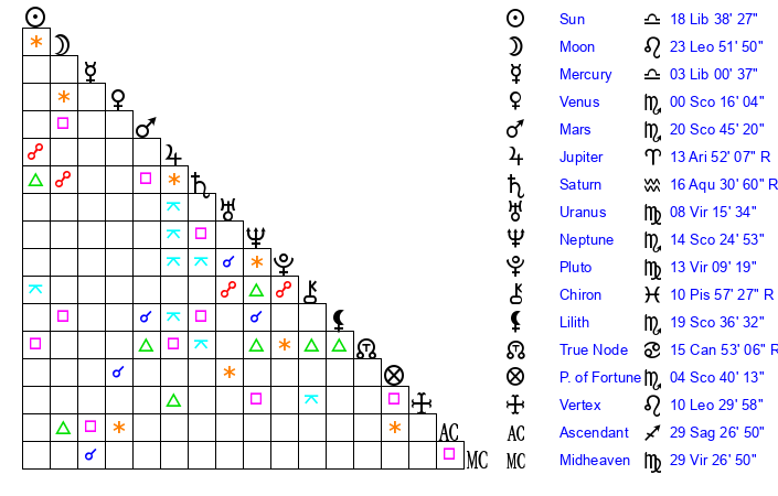 | Neptune | 14 Scorpio 24 | 0 Aries 13 | 16 Scorpio 39 |