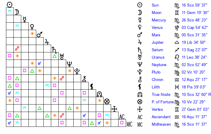 | Sun | 16 Scorpio 59 | 17 Scorpio 45 | 25 Capricorn 1 |