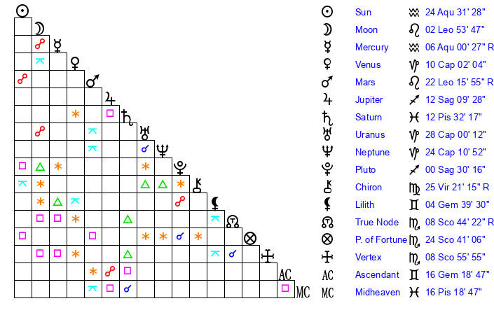 | Sun | 24 Aquarius 31 | 25 Aquarius 15 | 24 Pisces 38 |