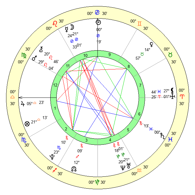 | Moon | 21 Cancer 7 | 9 Taurus 9 | 28 Virgo 21 |