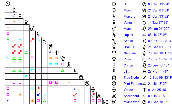 | Sun | 0 Cancer 19 | 0 Cancer 34 | 0 Leo 50 |