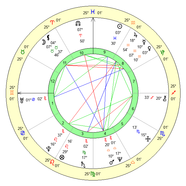 | Sun | 3 Pisces 31 | 4 Pisces 19 | 17 Taurus 31 |